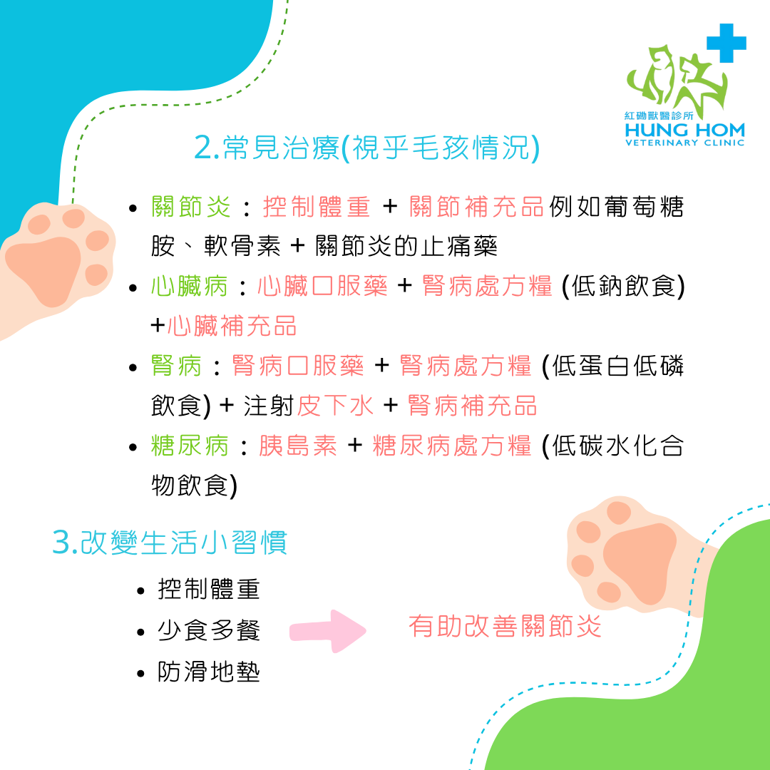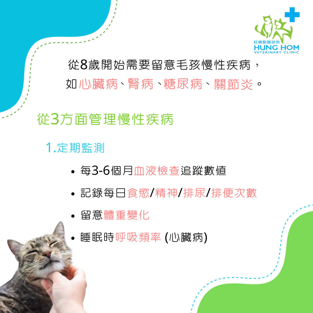 從8歲開始需要留意毛孩慢性疾病(如關節炎、心臟病、腎病、糖尿病)。透過積極管理,我們依然能陪伴牠們擁有充實的生活!